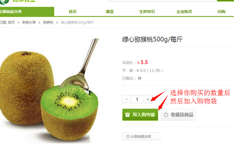 3:确定该商品后输入购买数量(500g、包装袋、包)后加入购物车