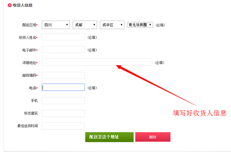 2:选择结算后,请填写配送地址等相关信息